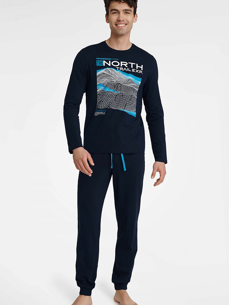 Men's pajamas consisting of a T-shirt and pants. T-shirt with long sleeves and a half-round neckline. Long pants with elastic band and tie at waist.