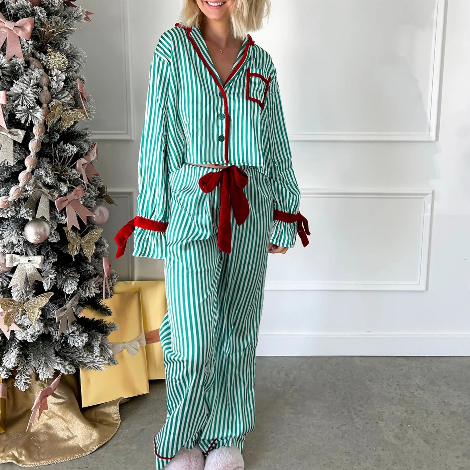 Womens Christmas Pajama Sets Striped Print Long Sleeve Button-up Shirts Tie-up Long Pants 2 Piece Sleepwear Pyjama Loungewear
